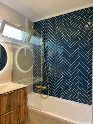 La rénovation de salle de bain intègre désormais un espace buanderie pratique et ergonomique. Cet aménagement sur-mesure accueille lave-linge et rangements sans sacrifier le confort d’utilisation.