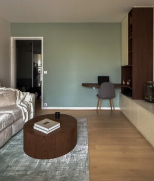 Dans le salon, nous avons créé un espace bureau discret et fonctionnel, intégré à un meuble sur-mesure offrant de nombreux rangements.