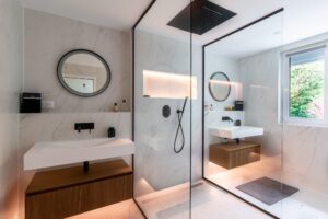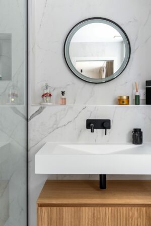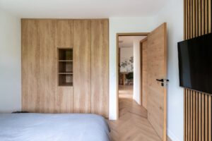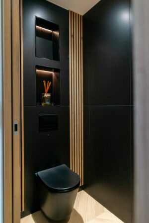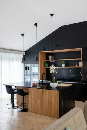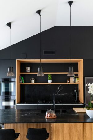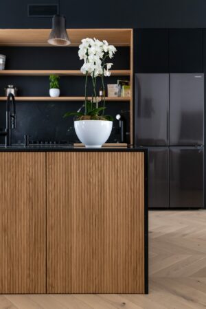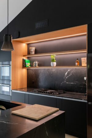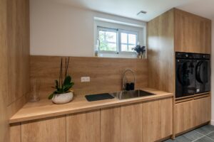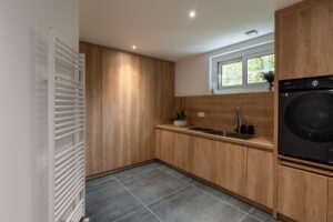 L’un des points forts du projet a été de rendre la buanderie facilement accessible grâce à une porte discrètement intégrée dans la façade de la cuisine, alliant praticité et esthétisme.